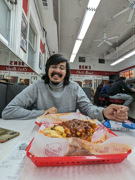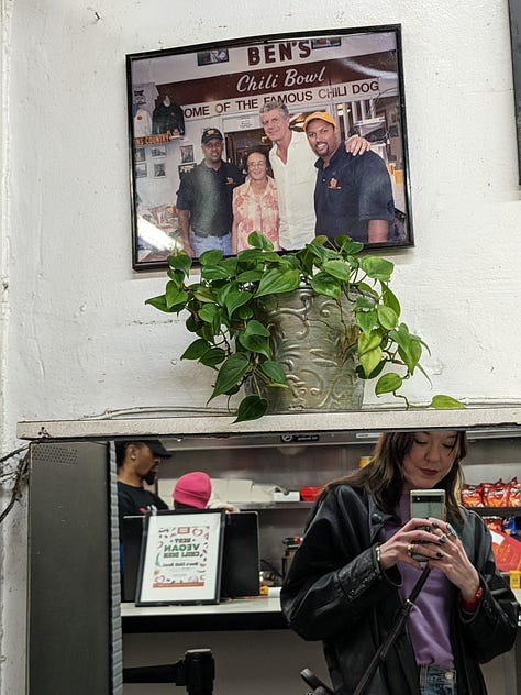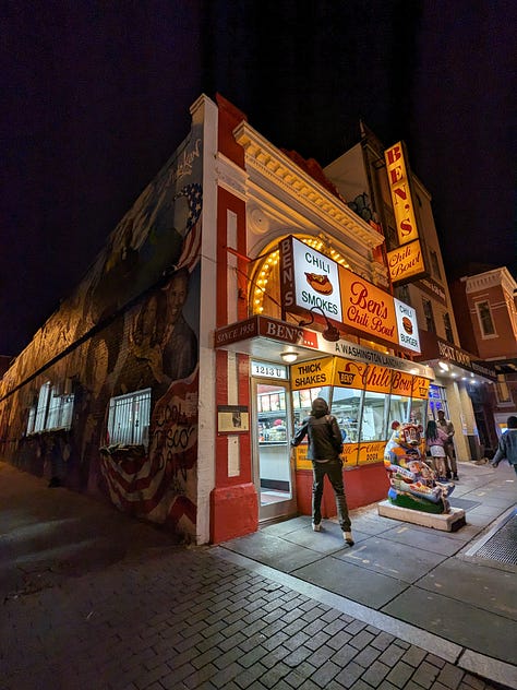 On Monday, we tried to walk through the zoo but it closes earlier than anticipated; instead, we found ourselves wandering in Rock Creek Park. Rock Creek Park is an urban park administered by the National Park Service that covers over 2000 acres. An estimated 2 million people visit the park annually. Despite these statistics, Neal (literally) ran into a jogging coworker from UCLA who he had never met in person, only on Zoom. We ended up arranging to meet her for drinks the next night. Coincidences like this are so mindblowing—what are the odds? Below is some important documentation of our romantic valentine’s day date at Ben’s Chili Bowl (we followed this meal with $18 cocktails at another location). I continue to be susceptible to the charms of DC.